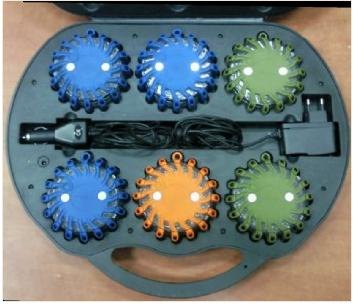 ערכה בת 6 יח´ של מהבהבים בתוך מזוודת פלסטיק הכוללת טעינה לכל שש היחידות במקביל בתוך המזוודה.לכל יח´ מספר רב של מצבי תאורה ומגנט המאפשר הצמדה לגג רכב או כל מקום מתכתי אחר.היחידות מאוד חזקות ועמידות בפני שברים.